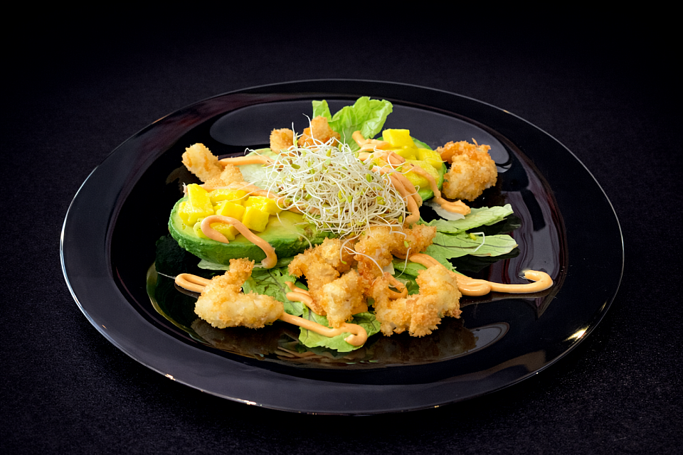 lechuga,aquacate,mango,langustino tempura, salsa coctel