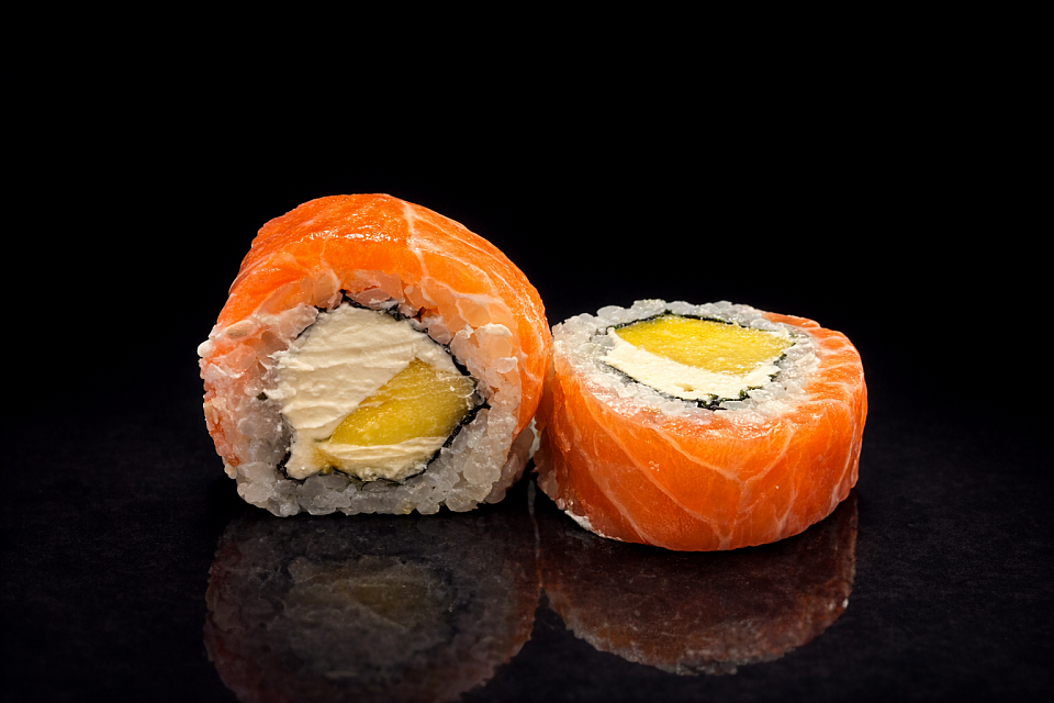 salmón, arroz, nori, mango, queso de Filadelfia