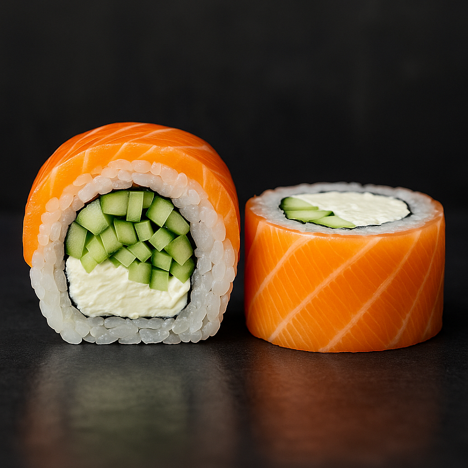 salmón, arroz, nori, pepino, queso de Filadelfia