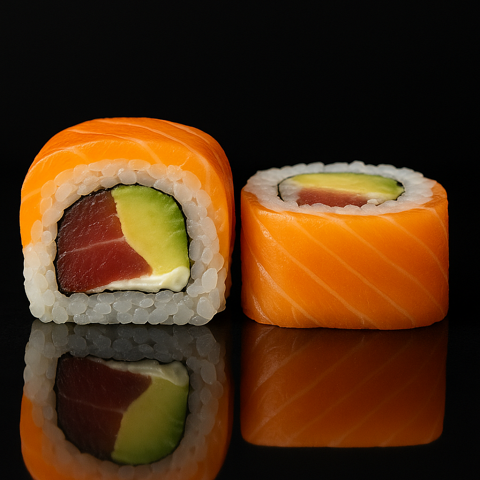 salmon,arroz,nori,aguacate,queso de Filadelfia,camarones