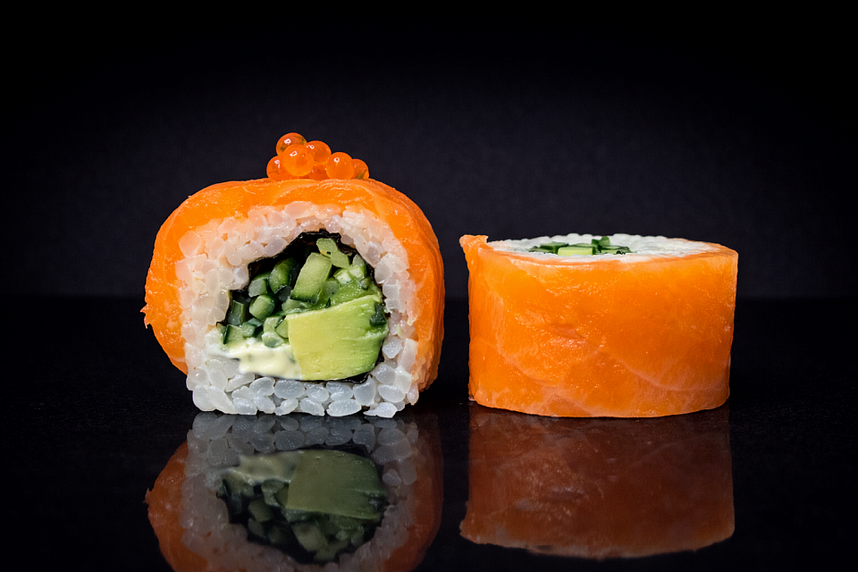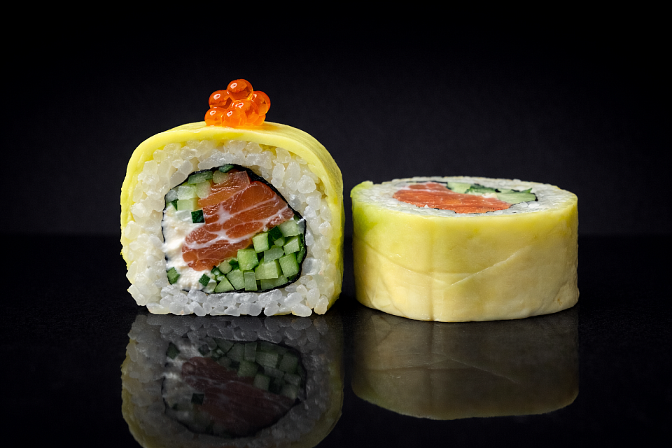 atún, arroz, nori, pepino, tomago,queso de Philadelphia, salsa picante