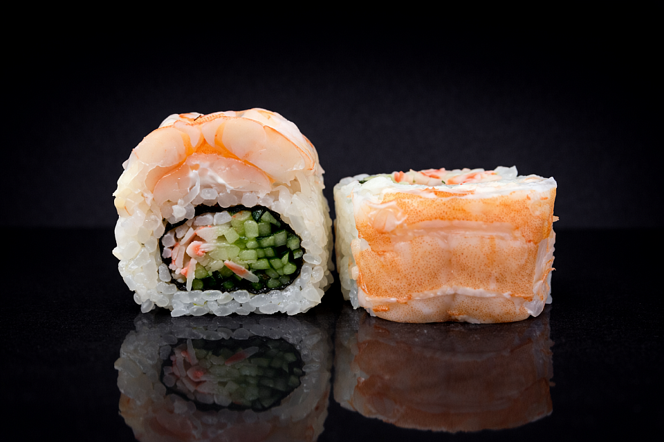 arroz,nori,camarones,pepino,surimi,queso de Philadelphia